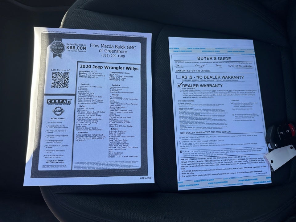 FLOW CERTIFIED! 2 year POWERTRAIN WARRANTY UP TO 100K MILES AND FLOW 2YR/24 000 MAINTENANCE PACKAGE** Clean CARFAX Brand New Mickey Thompson Baja Legends Rough Country Winch 4-Wheel Drive Swing Gate Decal 7.0" Touchscreen Display 97 MPH Vehicle Max Speed Calibration Air Conditioning w/Auto Temperature Control Air Filtering Anti-Lock 4-Wheel Disc HD Brakes Anti-Spin Differential Rear Axle Apple CarPlay Automatic Headlamps Black Grille Black Trail Rated Badge Cluster 7.0" TFT Color Display Deep Tint Sunscreen Windows Front 1-Touch Down Power Windows Front LED Fog Lamps Google Android Auto GPS Antenna Input Integrated Center Stack Radio Leather Wrapped Steering Wheel LED Headlamp & Fog Lamp Group LED Reflector Headlamps Matte Black Jeep Badge MOPAR All-Weather Floor Mats Power Heated Mirrors Quick Order Package 24W Willys Radio: Uconnect 4 w/7" Display Remote Keyless Entry Security Alarm SiriusXM Satellite Radio Speed Sensitive Power Locks Sun Visors w/Illuminated Vanity Mirrors Technology Group USB Host Flip Wheels: 17" x 7.5" Moab Black Aluminum Willys Willys Hood Decal Wrangler Decal.