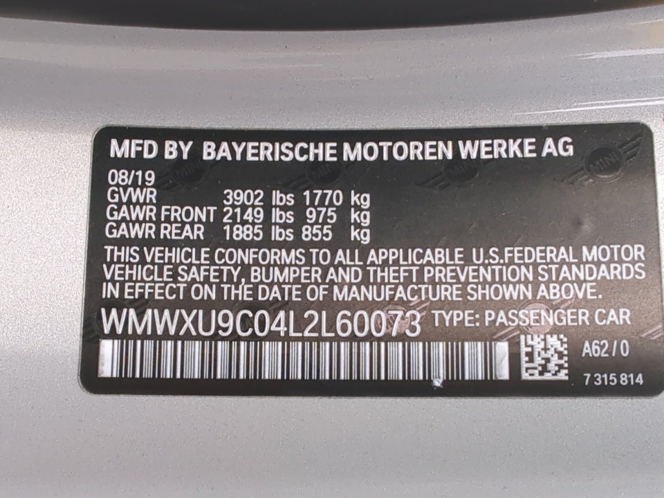 4-Wheel Disc Brakes 6 Speakers ABS brakes Air Conditioning Alloy wheels AM/FM radio Auto High-beam Headlights Automatic Climate Control Black Roof & Mirror Caps Brake assist Bumpers: body-color Comfort Access Keyless Entry Driver door bin Driver vanity mirror Dual front impact airbags Dual front side impact airbags Electronic Stability Control Emergency communication system Exterior Parking Camera Rear Four wheel independent suspension Front anti-roll bar Front Bucket Seats Front Center Armrest w/Storage Front fog lights Front reading lights Fully automatic headlights Heated door mirrors Heated Front Seats Illuminated entry Knee airbag Leather steering wheel LED Fog Lights LED Headlights w/Cornering Lights Low tire pressure warning MINI Assist eCall MINI Connected MINI TeleServices Occupant sensing airbag Outside temperature display Overhead airbag Panoramic Moonroof Passenger door bin Passenger vanity mirror Piano Black Interior Surface Power door mirrors Power steering Power windows Radio data system Rain sensing wipers Rear anti-roll bar Rear window defroster Rear window wiper Remote keyless entry SensaTec Leatherette Upholstery Signature Trim Speed control Speed-sensing steering Split folding rear seat Spoiler Sport Seats Sport steering wheel Steering wheel mounted audio controls Tachometer Telescoping steering wheel Tilt steering wheel Traction control Trip computer. 26/35 City/Highway MPG
