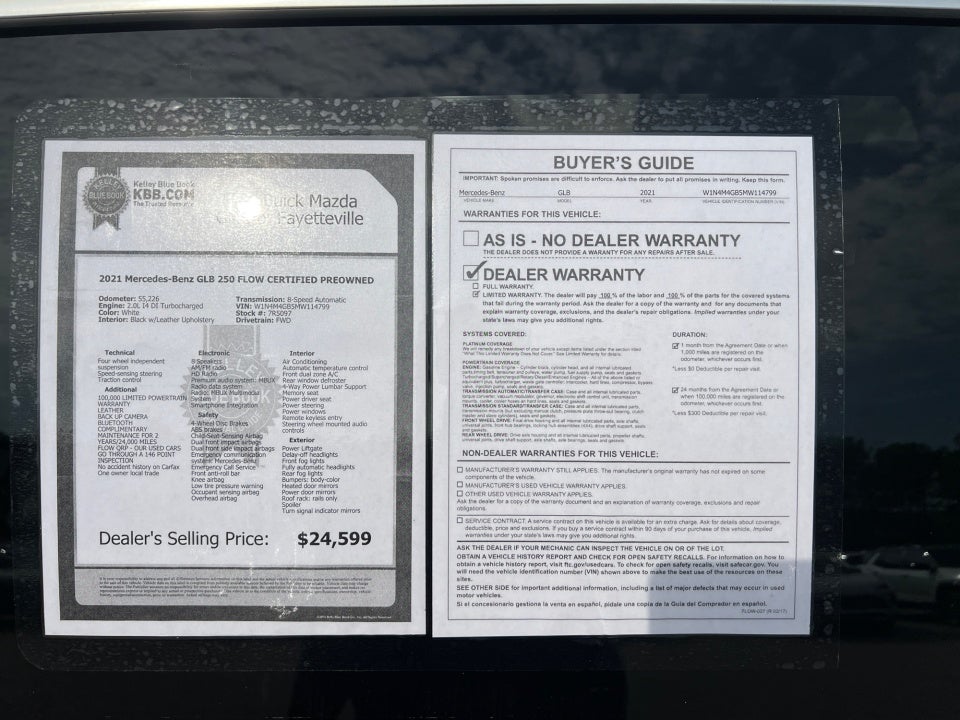 Flow Buick Mazda GMC of Fayetteville is proud to offer this fantastic 2021 Mercedes-Benz GLB White GLB 250 with the following features: FLOW CERTIFIED 2YR/100 000 MILE POWERTRAIN WARRANTY 3 day money back guarantee and a free maintenance package! ** 100 000 LIMITED POWERTRAIN WARRANTY LEATHER BACK UP CAMERA Bluetooth® COMPLIMENTARY MAINTENANCE FOR 2 YEARS/24 000 MILES FLOW QRP - OUR USED CARS GO THROUGH A 146 POINT INSPECTION No accident history on Carfax One owner local trade GLB GLB 250 FLOW CERTIFIED PREOWNED 4D Sport Utility 2.0L I4 DI Turbocharged 8-Speed Automatic FWD White Black w/Leather Upholstery.